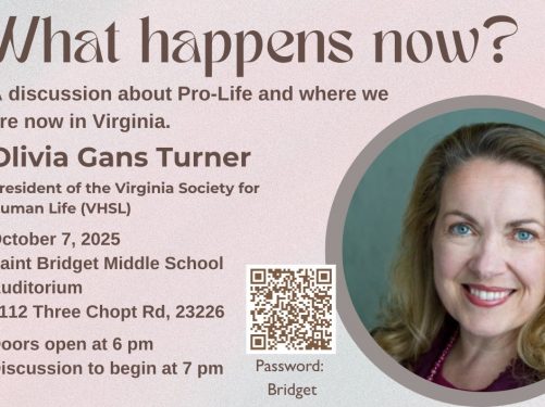 Read MoreOlivia Gans Turner, president of Virginia Society of Human Life, will be speaking at the St. Bridget Middle School Auditorium on October 7 at 7:00 p.m. Please join us for a discussion of pro-life issues and ...