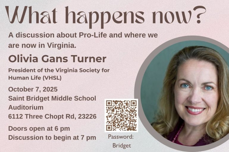 Olivia Gans Turner, president of Virginia Society of Human Life, will be speaking at the St. Bridget Middle School Auditorium on October 7 at 7:00 p.m.
