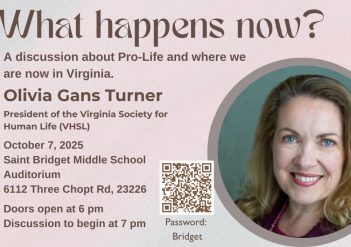 Read MoreOlivia Gans Turner, president of Virginia Society of Human Life, will be speaking at the St. Bridget Middle School Auditorium on October 7 at 7:00 p.m. Please join us for a discussion of pro-life issues and current events in Virginia.